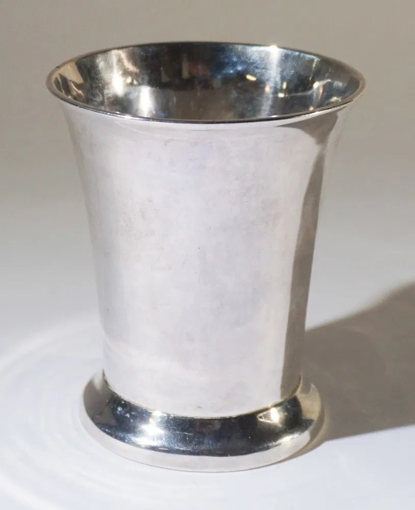 Circa 1755 by John Langlands working in Newcastle. Very fine early example having a nice well formed body with flared rim over well shaped foot. Hallmarked , H4" W3 3/8" 182 grams.